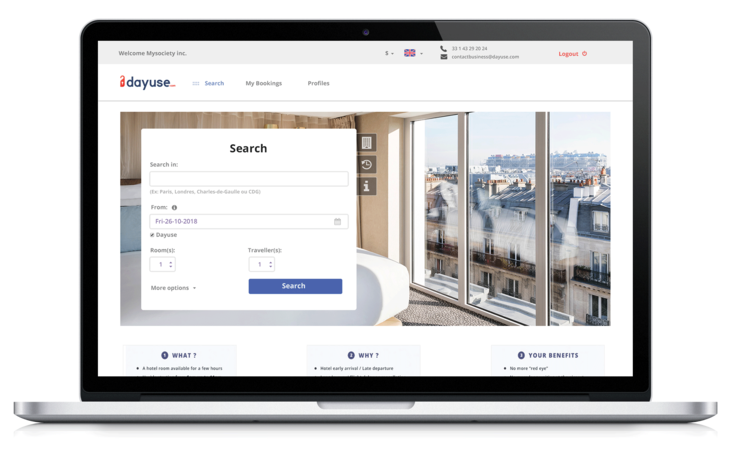 Über die Plattform «Dayuse Business» können Travel Manager nun direkt Tageszimmer für ihre Geschäftsreisenden entsprechend der Reiserichtlinien oder den Bedürfnissen der Vielreisenden buchen. Filter sind verfügbar nach Destination, Preis, Hotel und Art der Reise. Travel Manager haben die Möglichkeit, sich direkt auf «Dayuse Business» anzumelden und alle Serviceleistungen zu nutzen.