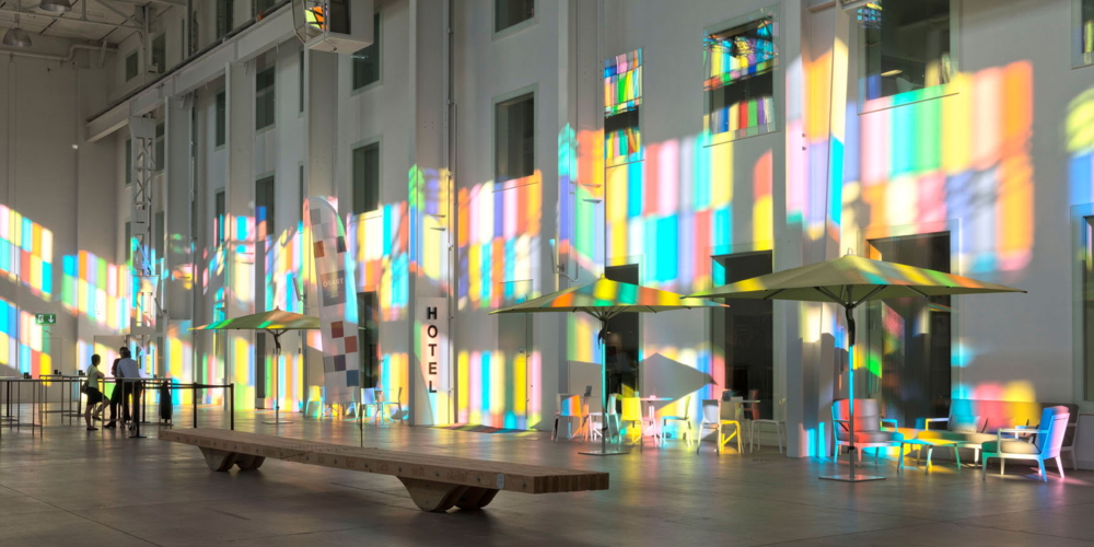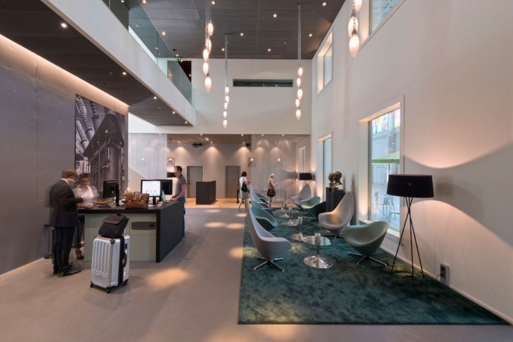 Von sämtlichen 45 Einzelzimmern des Dreisterne-superior-Hauses blickt man auf diesen «Stadtplatz», der in vielfarbiges Licht getaucht wird, wenn die Sonne durch die farbenfrohen Glasfenster scheint. (Die etwas grösseren Doppelzimmer gehen auf eine Zufahrt hinaus.) Trafo-Komplex und Trafohotel weisen aber nicht nur in die industrielle Vergangenheit, sondern auch in die virtuelle Zukunft: Wer sich für das Haus interessiert kann nämlich – ein Novum in der Schweizer Hotellerie – einen virtuellen Rundgang durch den Komplex buchen.