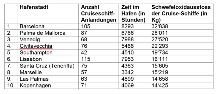 Nimmt man Kopenhagen - die dänische Hauptstadt erscheint überraschenderweise in den Top 10 der am meisten betroffenen Hafenstädte -, so musste die Stadt 2017 insgesamt 310'488 Kilogramm Stickoxide, 14'425 Kilo Schwefeloxide und 5738 Kilo Feinstaub allein wegen Kreuzfahrtschiffen ertragen. Die 206'000 Autos auf dänischen Strassen stiessen im selben Jahr 806'206 Kilo Stickoxide, 2511 Kilo Schwefeloxide und 93'640 Kilo Feinstaub aus. Man sieht, dass das Problem vor allem bei Schwefeloxiden liegt.