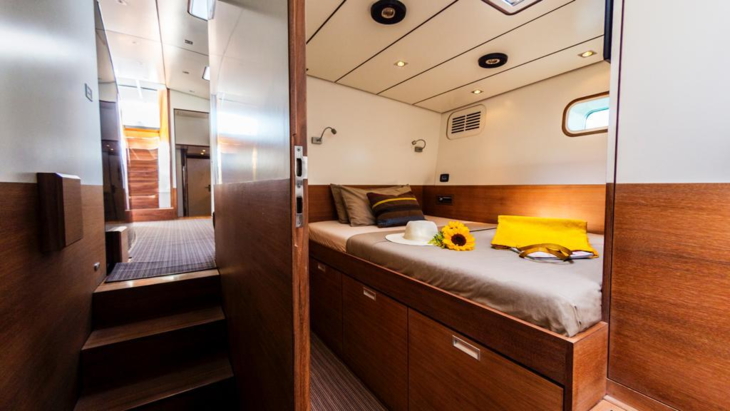 Hinsichtlich der erwähnten Modernisierung erklärt Zumstein, dass das Schiff aktuell auf Korfu einen «Refit» erhält, bei welchem beispielsweise ein ganz neues Deck verbaut wird. Die SY Aizu ist übrigens eine Aluminium-Segelyacht der Marke Tréhard mit zeitgenössischem Design; die Innenausstattung wurde vom bekannten schwedischen Design-Trio Claesson Koivisto Rune entworfen. Nebst den schönen Zimmer gibt es an Bord ein geräumiges Esszimmer mit einem grossen Esstisch, welcher mit dem Wohnzimmer verbunden ist. Das Wohnzimmer verfügt über einen 39-Zoll-Fernseher mit einem Bose-Surround-System. Die Küche ist vollständig mit Mikrowelle, Backofen und Geschirrspüler ausgestattet. Tagsüber lädt das Deck zum Entspannen und Sonnenbaden ein und eignet sich ideal für Abendessen mit Blick auf den Sonnenuntergang im Mittelmeer.