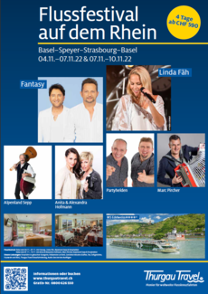Der Schweizer Flussreisespezialist Thurgau Travel hat eine spezielle Reise für alle Schlagerfans geplant: Während das luxuriöse Flussschiff MS Edelweiss die Gäste von Basel über Speyer nach Strasbourg und retour fährt, verwandeln Schlagerstars den Salon des Schiffes abends in eine grosse Bühne. Auf der Reise vom 4. bis 7. November treten Fantasy, Linda Fäh, Alpenland Sepp und die Partyhelden am einzigartigen Flussfestival auf. Auf der Fahrt vom 7. bis 10. November sorgen Anita & Alexandra Hofmann, Marc Pircher, Alpenland Sepp und die Partyhelden für Stimmung.