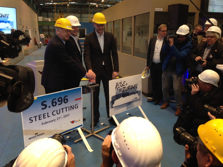 Thomas P. IllesBegleitet von einem grossen Medieninteresse wurde gestern auf der Meyer Werft in Papenburg der symbolische erste Stahlschnitt für die nächste Schiffsgeneration von Aida Cruises gefeiert. Den Startknopf der computergesteuerten Brennmaschine drückten Felix Eichhorn, Präsident von Aida Cruises sowie Tim Meyer und Bernard Meyer, Geschäftsführer der Meyer Werft, in demonstrativer Einigkeit gemeinsam.