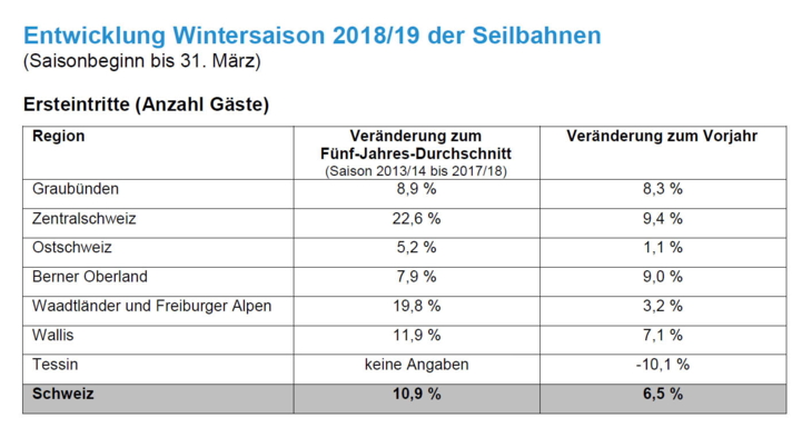 Insgesamt melden die Schweizer Seilbahnen ein Plus bei den Gästezahlen von 6,5 Prozent. Schon im letzten Jahr fiel ein Plus aus, dies nach mehreren rückläufigen Jahren beim Gästeaufkommen.