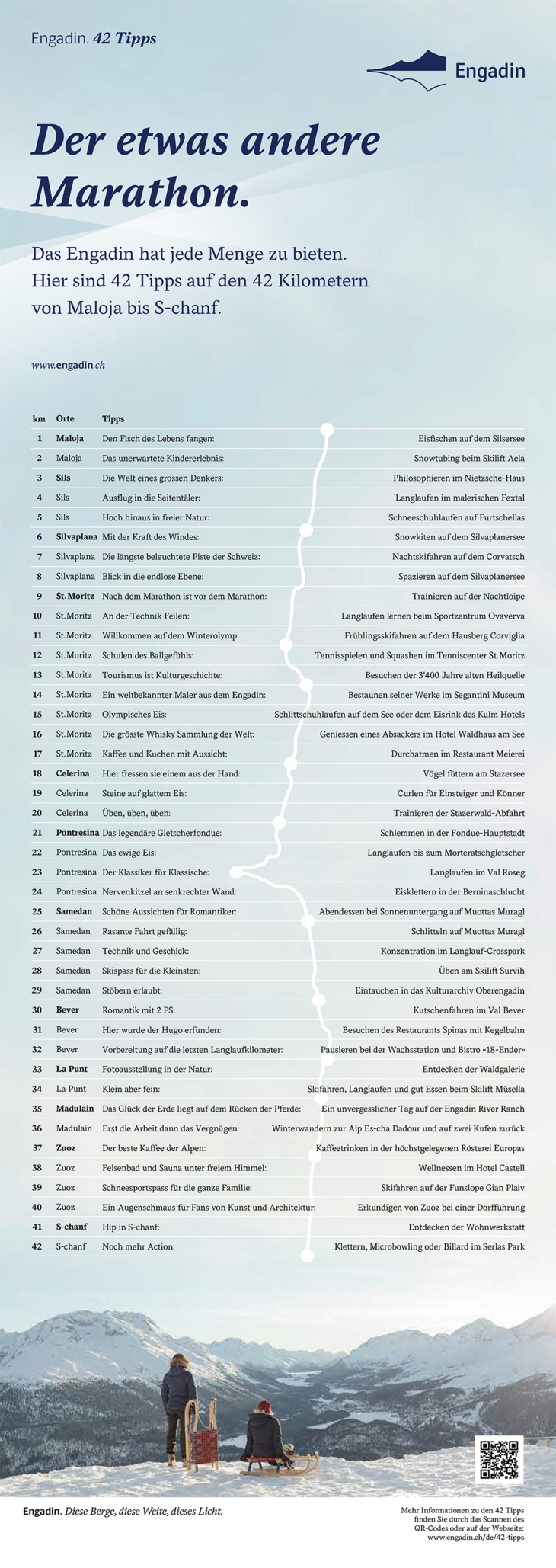 Der «etwas andere Marathon» präsentiert sich in Form einer Liste mit 42 Tipps für einen abwechslungsreichen Aufenthalt. Diese verteilen sich entlang der 42 Kilometer lange Strecke des Engadin Skimarathons.