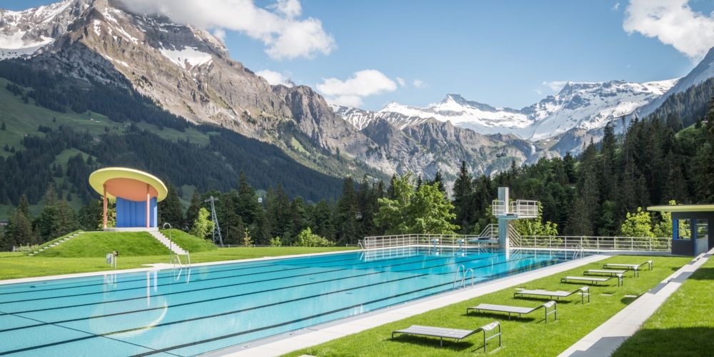 In Adelboden lassen sich dank dem «Gruebi» zwei Sehnsüchte kombinieren: sommerlichen Badespass sowie alpine Wildnis. Das kürzlich sanierte Freibad im Berner Oberland eignet sich hervorragend für ein unbeschwertes Baderlebnis mit sensationellem Rundblick auf schneebedeckte Berggipfel wie dem Wildstrubel-Massiv.