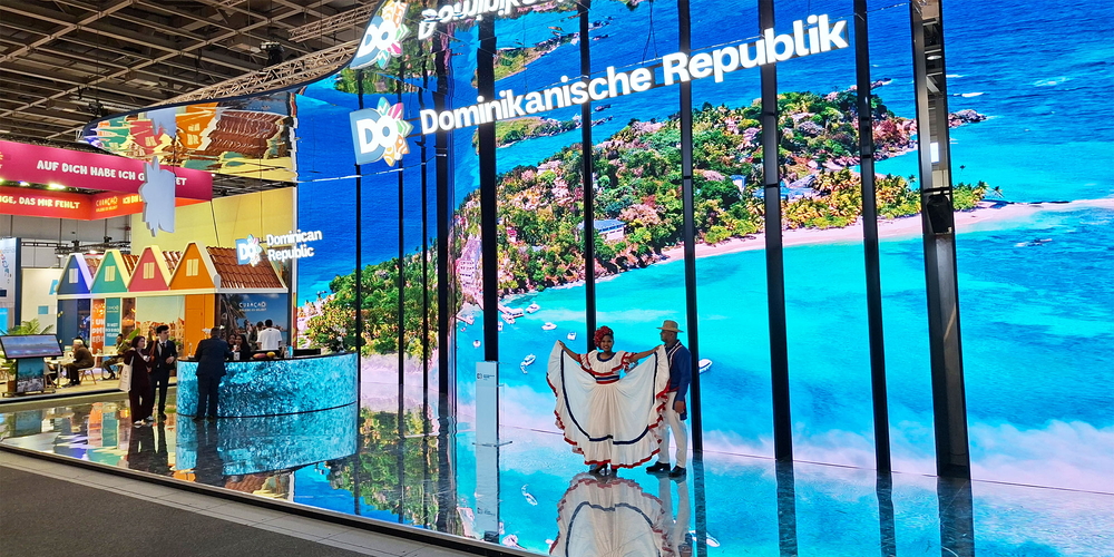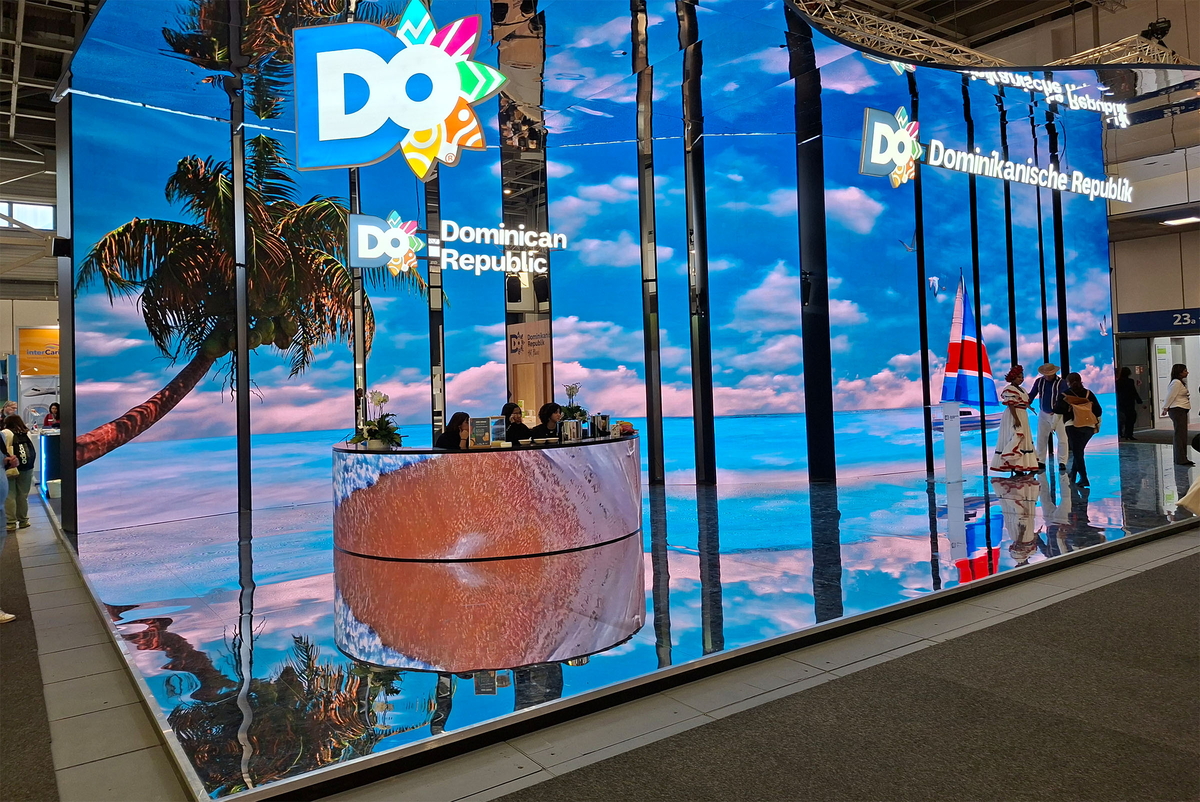 Die Grösse des Standes ist imposant, doch vor allem die Inszenierung zieht die Blicke auf sich: Auf einem riesigen Screen wechseln dynamische Animationen, die sofort ins Auge stechen. Die Dominikanische Republik setzt jedoch nicht nur auf Technik, sondern auch auf Menschen: Ein Paar in stilechtem Outfit posiert für Fotos und lockt zahlreiche Selfie-Jäger an. Der freistehende Haupt-Informationsdesk wirkt offen und einladend und unterstreicht das lebendige, herzliche Gesamtbild.