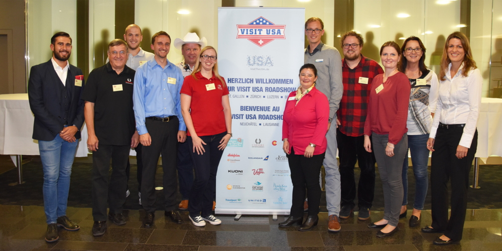 Und das sind die diesjährigen Aussteller, die mit Sicherheit bis morgen Abend heiser sein werden (auf dem Hauptbild von links): Fabio Di Canio (Hotelplan/Travelhouse), Richard Gugerli (Caesars Entertainment), Kenny-Lee Sommer (Visit Tampa Bay), Tino Swoboda (Kuoni Reisen), Klaus Boog (Kansas/Oklahoma Travel & Tourism), Stefanie Mehlhorn (The Beaches of Fort Myers & Sanibel), Eva Henss (St. Pete/Clearwater), Michael Liedtke (SeaWorld Parks & Entertainment), Marcel Sprenger (für Colorado Tourism Office und The Florida Keys & Key West), Elisabeth Kulmer (Las Vegas CVA), Vera Sommer (Bradenton Area CVB) und Louisa Bordewieck (VUSA-Projektleiterin).