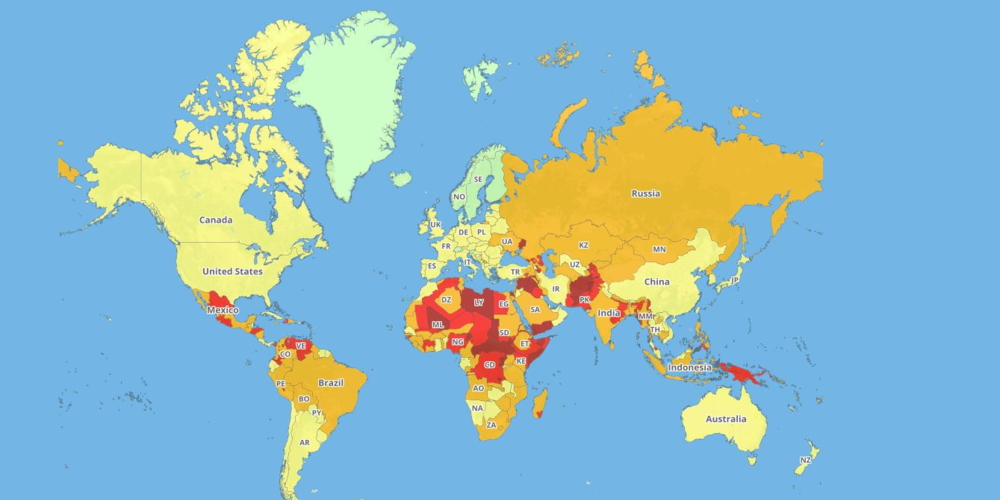 Dunkelrot eingefärbt auf der Karte sind bekannte Krisenherde wie Syrien, Afghanistan, Irak, Jemen, Libyen, Südsudan, Mali, Zentralafrikanische Republik sowie Teile von Pakistan, Somalia und der Ukraine. Hier beurteilen die Sicherheitsexperten die Gefahr als extrem hoch. Während die Gefahr in der Ukraine erstmals als extrem hoch eingeschätzt wurde, hat sich die Lage im Vergleich zum Vorjahr unter anderem in Nordkorea etwas verbessert.