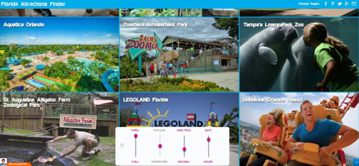 «If you can't find something to do in Florida, you're just boring», heisst es vor Ort gerne. Angesichts der enormen Vielfalt an Möglichkeiten hat die Tourismusvermarktungsgesellschaft des Staates, Visit Florida, auf ihrer Website den «Florida Attractions Finder» (Bild unten) eingerichtet. Das interaktive Online-Tool ermöglicht eine die Interessen des Besuchers berücksichtigende Informationssuche. Per Schieberegler können die Präferenzen eingestellt werden; daraufhin erhält man umgehend mit Videos hinterlegte Informationen.