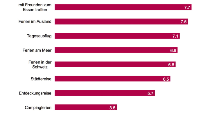 Als grundsätzlich attraktiver gelten Ferien im Ausland (mit einem Mittelwert von 7,5) gegenüber Ferien in der Schweiz (6,8). Entdeckungsreisen, Tagesausflüge oder auch Städtereisen werden von einer Mehrheit insgesamt als attraktive Freizeitbeschäftigung wahrgenommen. Die einzige Aktivität, die nur eine Minderheit zu begeistern vermag, sind Campingferien. Sich mit Freunden zum Essen zu treffen gehört für die Einwohnerinnen und Einwohner der Schweiz zum Alltag und somit zu den liebsten Freizeitbeschäftigungen.