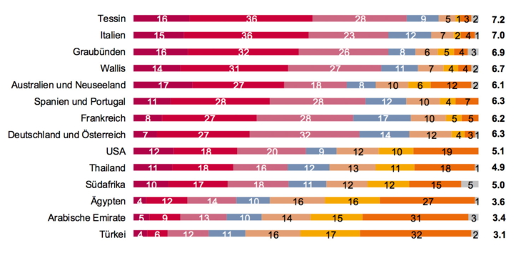 Bei der Attraktivität von Reisedestinationen haben die Marktforscher 14 Ziele vorgegeben, die einzeln bewertet werden mussten. Das Tessin schwingt bei den errechneten Mittelwerten oben auf, vor Italien, Graubünden und dem Wallis: