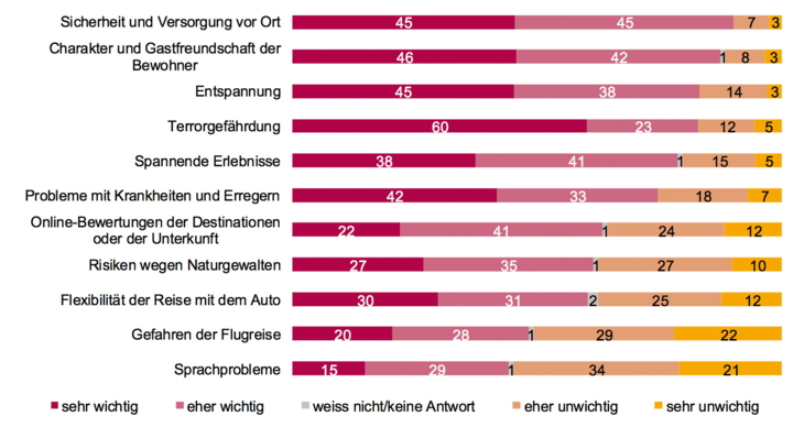 60 Prozent der Befragten taxieren die Terrorgefährdung als sehr wichtiges Element, das bei der Reiseplanung berücksichtigt wird. Die Sicherheit und die Versorgungslage vor Ort sind für die Mehrheit der Einwohnerinnen und Einwohner ebenfalls sehr oder eher wichtig. Weitere Risikofaktoren wie Probleme mit Krankheiten und Erregern oder die Angst vor Naturgewalten sind zwar für eine Mehrheit ebenfalls wichtig, stehen aber in der Priorität hinter positiven Treibern wie Charakter und Gastfreundschaft der lokalen Bevölkerung oder der Gelegenheit zum Entspannen oder Spannendes zu erleben zurück.