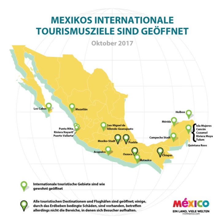Die Erdbeben im vergangenen Monat, welche Teile der mexianischen Regionen Chiapas, Oaxaca, Puebla, Mexiko-Stadt und Morelos trafen, hatten in den Tourismusgebieten keine Auswirkungen. Dies hat das mexikanische Fremdenverkehrsamt in einer neuen Mitteilung hervorgehoben. Alle wichtigen Reiseziele, darunter Los Cabos, Cancun-Riviera Maya, Merida, Puerto Vallarta oder Guadalajara blieben unberührt. Alle beliebten Attraktionen, Flughäfen und Tourismusgebiete funktionieren einwandfrei.