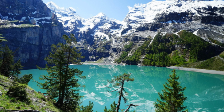 Der Oeschinensee im Kanton Bern gehört zu den grösseren Alpenseen in der Schweiz und zählt seit 2007 zum UNESCO-Weltnaturerbe «Schweizer Alpen Jungfrau-Aletsch». Auf 1578 Meter gelegen, ist der Bergsee rund 50 Meter tief. Das Wasser ist sehr sauber, gleichzeitig aber auch meistens ziemlich frisch. Am südlichen und westlichen Seeufer befinden sich einfache Badestellen mit kleinen Kiesstränden. Zudem wartet der Bergsee auch mit einem Hotel samt Restaurant und Feuerstelle, einer im Sommer betriebenen Rodelbahn und mehreren Ruder- und Fischerboote auf, welche von Mai bis Oktober gemietet werden können. Das Gebiet um den Oeschinensee ist ein beliebtes Wandergebiet, der See ist von Kandersteg her über mehrere leichte Routen problemlos erreichbar.