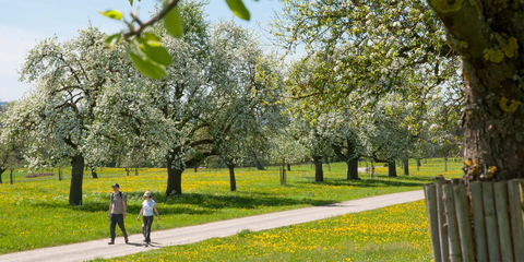 Wenn im Frühling die Obstbäume blühen, wirkt die Landschaft fast märchenhaft. Wir zeigen fünf kurze Wanderungen durch besonders schöne Obstgärten der Schweiz – vom Bielersee bis zum Thurgauer Seerücken.