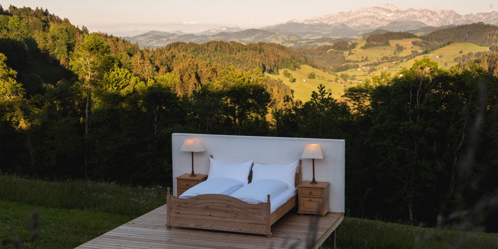 «Die Landschaft der Schweiz wird zur Tapete von Zimmern ohne Dach und Wände», so lautete die Vision 2016 von den «Null Stern»-Erfindern, Frank und Patrik Riklin, Konzeptkünstler im Atelier für Sonderaufgaben und Hotelexperte Daniel Charbonnier, Minds in Motion SA. Das Trio setzt auf konsequente Immobilienbefreiung und hinterfragt die Grenzen und Normen von Luxus und Standards in der Hotellerie an der Schnittstelle von Kunst und Tourismus. Im Rahmen des Projekts «Zero Real Estate» werden ab 1. Juli sieben solche Hotelzimmer in den Ostschweizer Tourismus-Destinationen St.Gallen-Bodensee, Toggenburg, Heidiland, Appenzellerland AR, Thurgau, Schaffhauserland sowie im Fürstentum Liechtenstein umgesetzt. Die Idee war, dass jede Destination eine bestehende Ressource aus einem Hotel «herausreisst» und an aussergewöhnlicher Lage neu inszeniert.