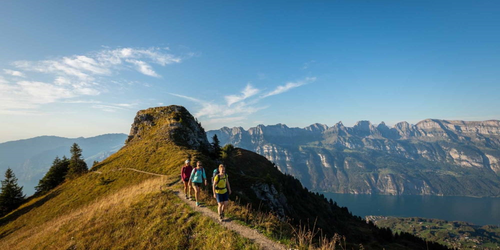 Start dieser rund dreistündigen Wanderung ist bei der Bergstation Luftseilbahn Niederbauen auf 1573 Meter über Meer. Bergfahrt mit der Luftseilbahn von Emmetten auf den Niederbauen. Von hier aus folgt der knackige Aufstieg über die Alp Tritt zur Niederbauen Chulm. Abstieg zum Aussichtspunkt Hunds-Chopf und anschliessend lockere Wanderung zurück zur Bergstation der Luftseilbahn Niederbauen. Anreisen kann man bequem mit dem Auto, Gratisparkplätze sind bei der Talstation vorhanden, oder mit dem Öffentlichen Verkehr mit dem Bus ab Beckenried. Auf die Wanderer wartet ein grandioser Blick in die umliegende Bergwelt. Weitere Informationen.