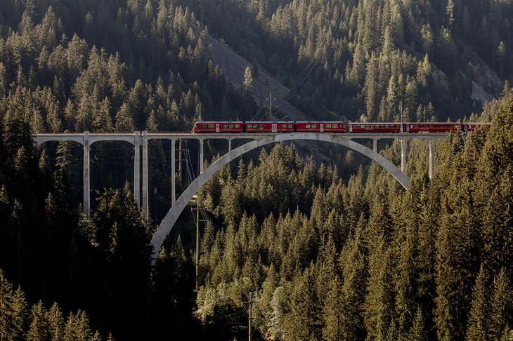 Mit dem Zug dauert die Fahrt ab Zürich HB nach Arosa knapp zweieinhalb Stunden – und sie gehört zu den schönsten Bahnreisen der Schweiz. Ab Chur nimmt die Rhätische Bahn Kurs auf die Berge und überwindet auf nur 26 Kilometern 1000 Höhenmeter. Höhepunkt der Strecke ist das majestätische Langwieser Viadukt, das seit über 100 Jahren mit seinen 284 Metern Länge und 62 Metern Höhe als technisches Meisterwerk die Schanfigger Landschaft prägt. Vom Bahnhof Arosa bringt ein Shuttle-Bus zwischen 8.15 und 17.15 Uhr im 15-Minuten-Takt die Gäste bequem ins Hotel.