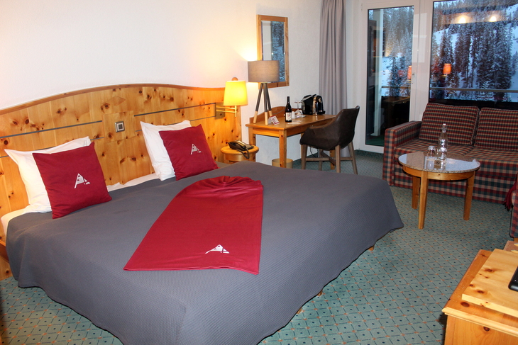 Ich beziehe ein grosszügiges Superior-Doppelzimmer, das Platz für bis zu drei Gäste bieten würde – doch dieses Mal habe ich es ganz für mich allein. Der Komfort lässt keine Wünsche offen: Ein flauschiger Bademantel liegt für den Gang in die Wellness-Oase bereit, ein Schreibtisch bietet Raum für produktive Momente, und auch im Badezimmer fehlt es an nichts. Vom Balkon aus eröffnet sich ein traumhafter Blick auf die umliegenden Berge, wo ich die Morgen- und Mittagssonne geniessen kann. Auch an die kleinen Freuden des Lebens wurde gedacht: Eine Kapselmaschine sorgt dafür, dass meine regelmässige Kaffee-Zufuhr gesichert ist.
