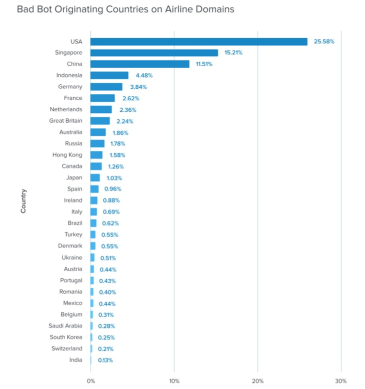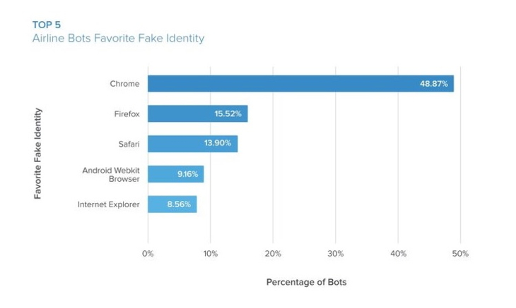 Demzufolge kommen 43,9 Prozent des Traffics auf Airline-Webseiten von Bots, also von automatischen und zumeist mit böswilligen Zielen operierenden Computerprogrammen. Zum Vergleich: In anderen Industriesektoren liegt dieser Anteil durchschnittlich bei 21,8 Prozent. Nun sind nicht alle Bots «böse», auch herkömmliche Webcrawler von Internet-Suchmaschinen, Metasearchern oder OTAs sind ja Bots. Dennoch ist laut Distil Network über die Hälfte des Traffics auf den Webseiten von 51 untersuchten Airlines auf so genannte «Bad Bots» zurückzuführen. Die Airline-Industrie ist demnach auch das zweitbeliebteste Ziel von Cyberattacken, hinter dem Online-Gambling-Bereich. Die Cyberattacken dieser Bots sind natürlich darauf ausgelegt, Zahlungsdaten oder auch Vielfliegerpunkte/-meilen von Airline-Kunden zu ergattern.