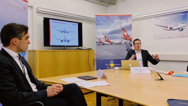 Seit dem 25. Februar 2019 wartet Helvetic Airways ihre Flugzeuge am Flughafen Zürich in einem grösseren Hangar. Im «Hangar 1», bei Tor 141 auf dem Gelände der SR Technics, empfingen CEO Tobias Pogorevc und COO Simon Schatzmann diese Woche zum Fachgespräch im kleinen Rahmen.
