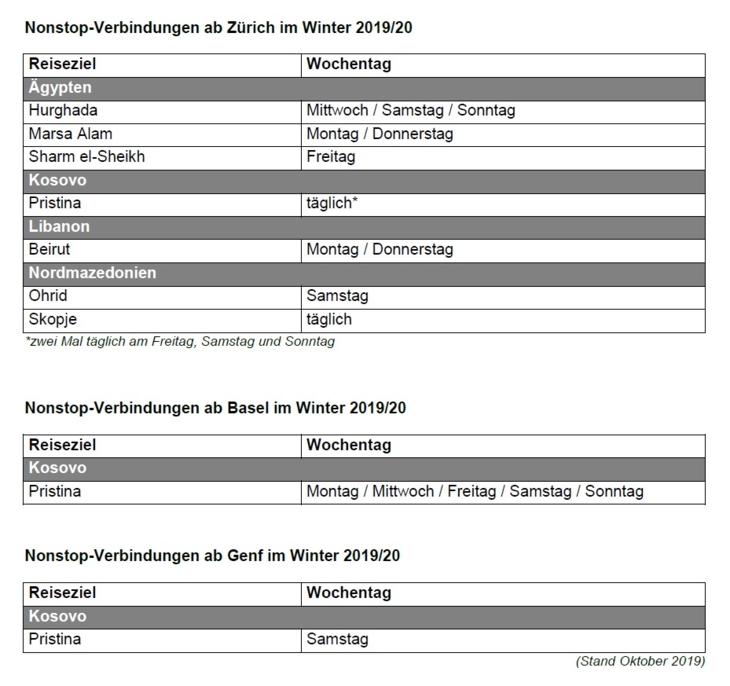 Die Schweizer Fluggesellschaft Chair Airlines ist startklar für den Winter 2019/20. Und dies mit einer wesentlichen Neuerung: Von Anfang November 2019 bis Ende April 2020 wird die kosovarische Hauptstadt Pristina neben den teils mehrmals täglichen Flügen ab Zürich neu auch nonstop ab Basel (täglich) und ab Genf (samstags) bedient und erstmals auf www.chair.ch buchbar gemacht. Ebenfalls neu im Einzelplatzverkauf erhältlich sind Flüge ab Zürich in die nordmazedonischen Metropolen Skopje (täglich) und Ohrid (sonntags).