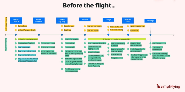 Auch Simpliflying geht davon aus, dass es künftig einen Gesundheitspass geben wird, welcher beim Check-in – ob online oder am Flughafen – vorgewiesen werden muss. Darüber hatte Travelnews auch schon berichtet. Das Check-in-Personal, hinter Plexiglasschreiben geschützt, könnte allenfalls die Sitze manuell zuweisen – damit Distanzregeln eingehalten werden und dennoch etwa Familien beieinander sein können. Das verlangsamt den Check-in-Prozess am Flughafen deutlich, bzw. verändert das Online-Check-in markant.