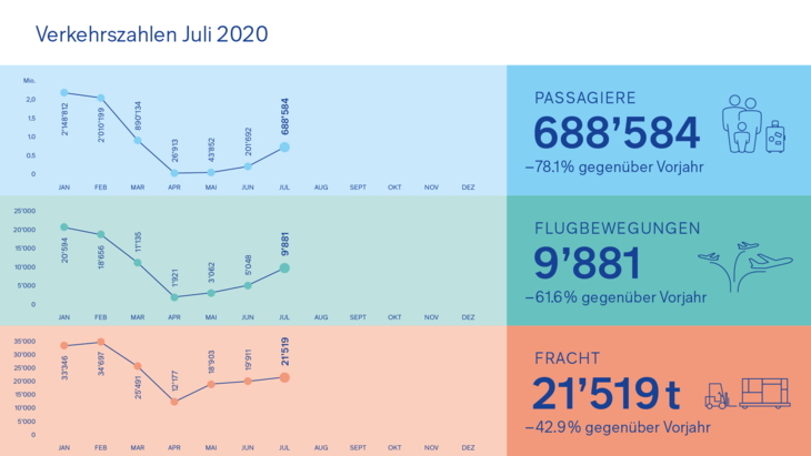 Die Anzahl Lokalpassagiere sank im Juli 2020 um 75 Prozent auf 563'354. Der Anteil der Umsteigepassagiere lag bei 17,5 Prozent, was einem Minus von 10,8 Prozent gegenüber dem Vorjahr entspricht. Weiter sank die Zahl der Umsteigepassagiere um 86,5 Prozent auf 119'682.