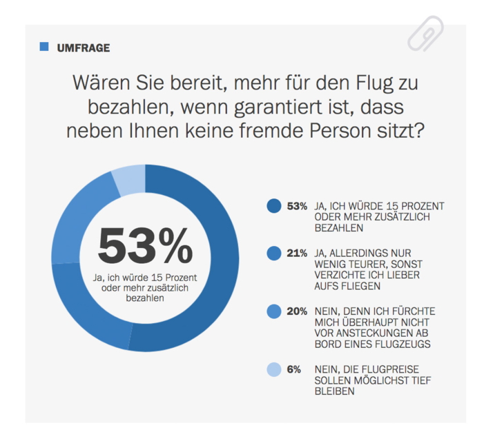 Travelnews hat hierfür im Rahmen des genannten Artikels eine Umfrage lanciert. Die Teilnahme ist nicht mehr möglich; insgesamt haben 254 Personen an der Umfrage teilgenommen. Das Verdikt ist klar: 53 Prozent der Antwortenden erklärten, sie würden einen Aufpreis von 15 Prozent oder mehr hinnehmen, um garantiert zu haben, dass keine fremde Person neben ihnen sitzt. Nur jeder Fünfte erklärte, ihm sei die Frage grundsätzlich gleichgültig, weil man eh keine Infektion im Flugzeug befürchte. Ebenfalls rund jeder Fünfte erklärte, man würde gern den Mittelsitz freihalten können, allerdings nur zu geringen Kosten, ansonsten man - also bei stark steigenden Flugkosten - aufs Fliegen verzichten würde. Interessant auch: Fast niemand, gerade mal 6 Prozent der Antwortenden, erklärte, dass die Flugpreise grundsätzlich einfach tief bleiben sollen. Man scheint sich also darauf einzustellen und akzeptiert auch die Tatsache, dass Flugpreise in naher Zukunft tendenziell wieder teurer sein werden.
