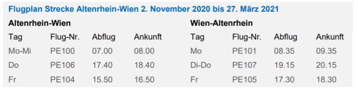 Die neusten Entwicklungen in der gegenwärtigen Krise erfordern weitere Anpassungen in den Flugfrequenzen der People's Air. Nachdem die Airline aufgrund verschärfter Schutzmassnahmen von Österreich und der Schweiz bereits Ende September die Flugverbindungen zwischen St. Gallen Altenrhein und Wien reduziert hat, wird der ausgedünnte Flugplan nun bis 27. März 2021 verlängert.
