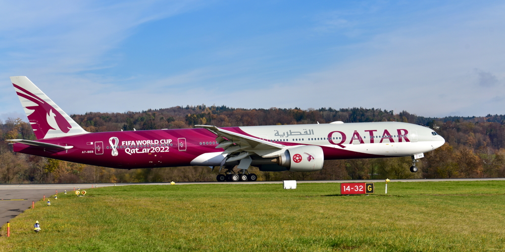 Am 21. November 2022 wird der erste Ball der nächsten Fussball-WM rollen. Diese findet in Katar statt, also erstmals in einem arabischen Land und erstmals im Spätherbst. Um Fans aus aller Welt in den Kleinstaat zu fliegen, ist Qatar Airways bereits jetzt offizieller Partner und Fluggesellschaft der FIFA (Fédération Internationale des Football Associations), also dem Ausrichter der Fussball-WM. Und auf den Tag genau zwei Jahre vor Beginn der WM hat Qatar Airways eine speziell lackierte Boeing 777 in den Farben der FIFA Fussball-WM «Qatar 2022» enthüllt. Und wo landete dieses Flugzeug erstmals? Natürlich in Zürich, wo sich der Hauptsitz der FIFA befindet.