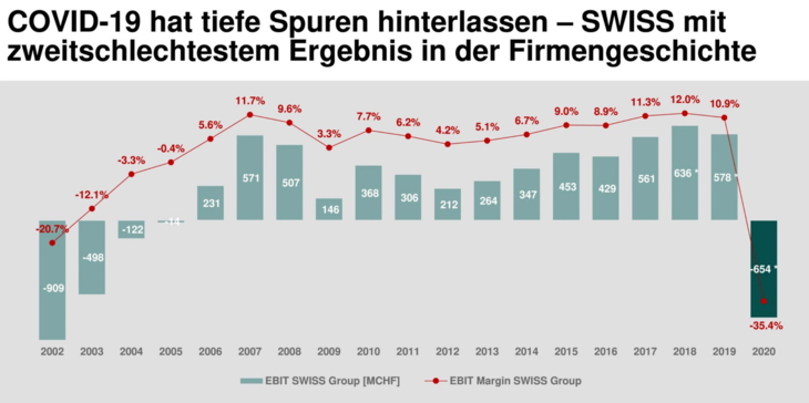 Gegenüber dem Vorjahr brach der Umsatz der Swiss im Jahr 2020 um 65,2 Prozent ein und lag noch bei 1,85 Milliarden Franken; der operative Verlust betrug 654 Millionen Franken - 2019 war es noch ein Gewinn von 578 Millionen Franken. Die Corona-Pandemie und die daraus resultierenden weltweiten Einreisebeschränkungen haben zu einem beispiellosen Einbruch der Nachfrage und zu diesem massiven Umsatzrückgang geführt.