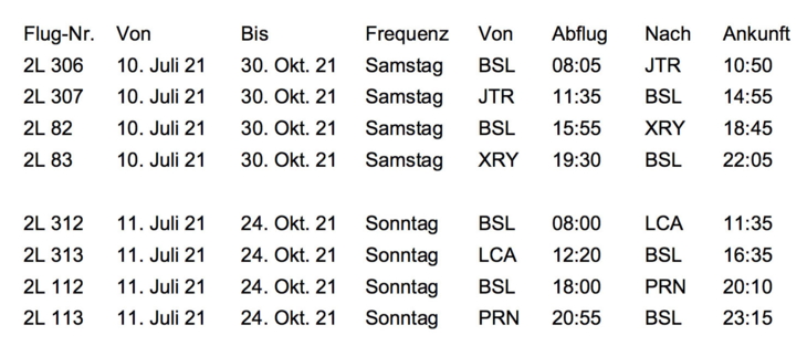 Mit Beginn der Sommerferien, am 10. Juli 2021, beginnen die Helvetic-Rotationen Richtung Mittelmeer – und sie dauern an bis zum Ende der Herbstferien am 24. Oktober. Jeweils am Samstag fliegt Helvetic von Basel auf die griechische Insel Santorini (JTR) wie auch nach Jerez (XRY) in Andalusien. Am Sonntag fliegt Helvetic dann nach Larnaca (LCA) auf Zypern und Pristina (PNA), in die Hauptstadt Kosovos. Primär stehe die Embraer E195-E2 mit 134 Sitzen im Einsatz, die Embraer E190-E1 mit 112 Sitzen diene als Backup, sagt Helvetic-Sprecher Mehdi Guenin. Ob weitere Charter-Rotationen oder Wet Leases hinzukommen, sei noch offen.