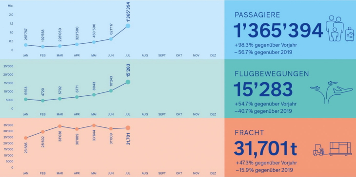 Die Anzahl Lokalpassagiere lag im Juli 2021 bei 1,037 Millionen. Knapp 321'000 Personen waren Umsteigepassagiere, was einem Anteil von 23,6 Prozent entspricht. Die Anzahl Flugbewegungen stieg im Vergleich zum Vorjahresmonat um 55 Prozent auf 15'283 Starts oder Landungen. Verglichen mit Juli 2019 fanden den Angaben zufolge allerdings noch immer 41 Prozent weniger Flugbewegungen statt. Die durchschnittliche Zahl Passagiere pro Flug lag mit 116,6 Fluggästen 11,3 Prozent über dem Vorjahreswert, die Sitzplatzauslastung stieg um 5,8 Prozentpunkte auf 68,1 Prozent.