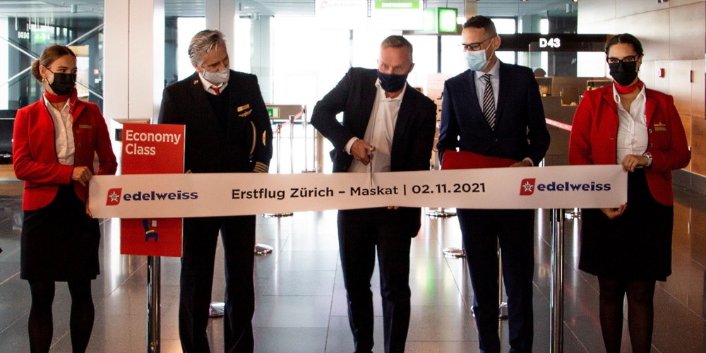 Die Erstflüge nach Sal (Kapverden) am 1. November und Muskat (Oman) am 2. November feierte Edelweiss mit einem traditionellen «Ribbon Cut» am Gate am Flughafen Zürich. Edelweiss-CEO Bernd Bauer begrüsste am Gate vor dem Boarding die Fluggäste gemeinsam mit Florian Raff (Head Aviation Development & Statistics, Flughafen Zürich AG) und der Edelweiss-Crew. Mit Agadir in Marokko folgte am 3. November dann bereits der dritte Erstflug in dieser Woche für Edelweiss.