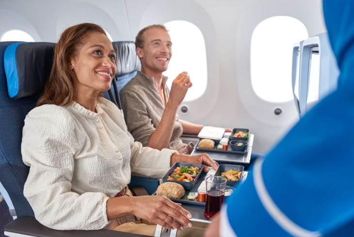 Das Verpflegungskonzept in der Premium Comfort Class ist ebenfalls neu: Je nach Flugdauer werden den Passagieren ein oder zwei warme Mahlzeiten serviert. Die Speisekarte besteht hauptsächlich aus Gerichten, die sich in der World Business Class bewährt haben, und die Fluggäste können stets zwischen Fleisch-, Fisch- und vegetarischen Gerichten wählen.