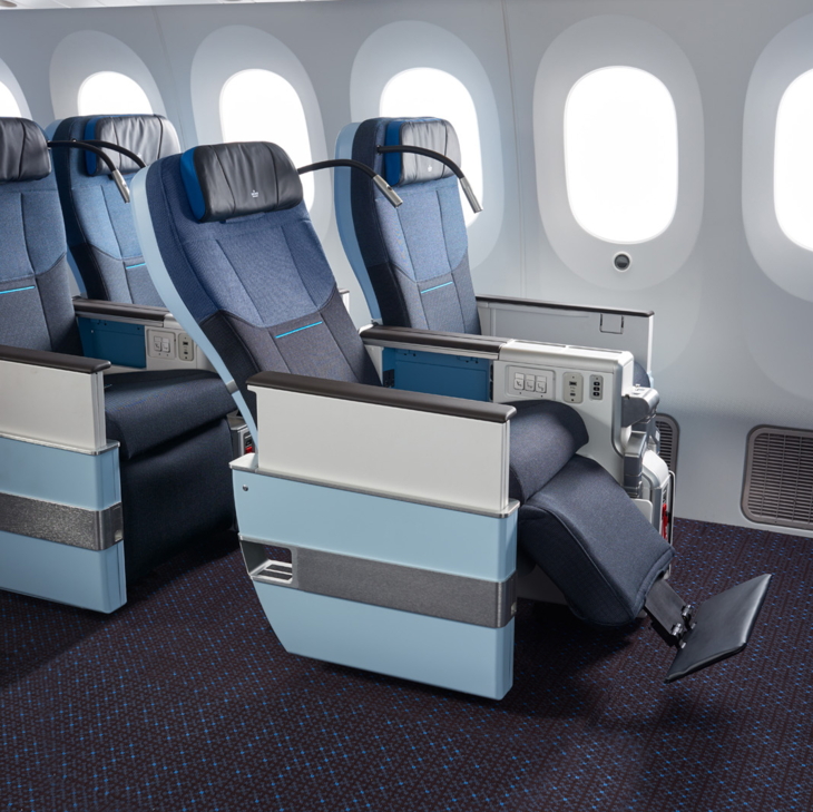 Die neuen Premium Comfort Class-Sitze wurden von Collins Aerospace hergestellt und in Zusammenarbeit mit KLM angepasst. Neben ihrem eleganten Design und den Komfortmerkmalen sind die Sitze auch leichter als frühere Modelle.