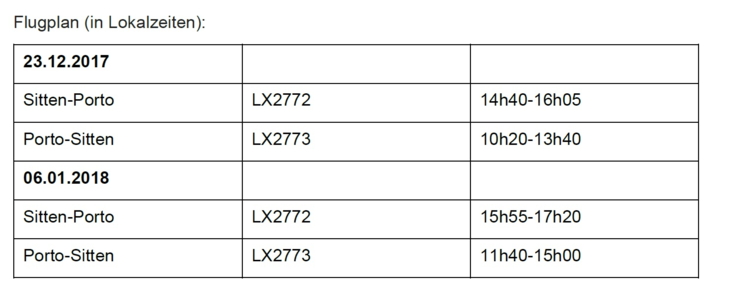 der Weihnachtszeit sind zwei Hin- und Rückflüge zwischen Sitten und der zweitgrössten Stadt Portugals vorgesehen.