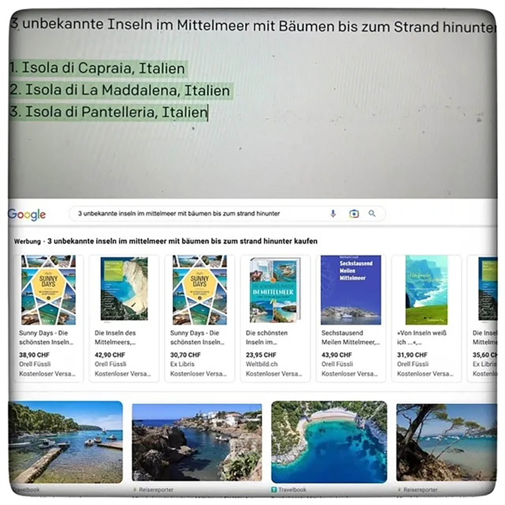 In einer dritten und letzten Aufgabe geht es darum, Google und den Chatbot als Inspirationsquelle anzuzapfen. Dazu habe ich eine denkbar einfache Frage formuliert: «3 unbekannte Inseln im Mittelmeer mit Bäumen bis zum Strand hinunter.»