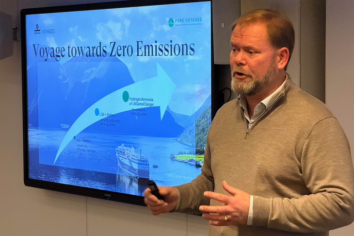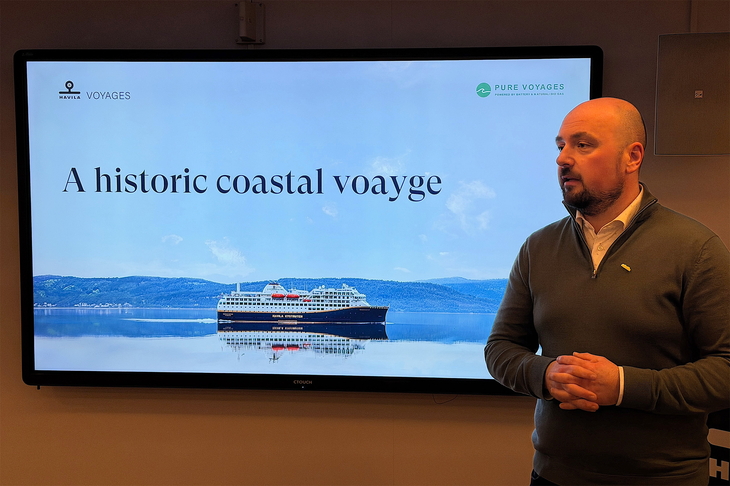 Sinnbildlich startete Havila-CEO Bent Martini seine Präsentation an Bord mit einem Bild, das in einem Fjord zwei Schiffe zeigte: ein Havila-Schiff, das dank seiner installierten Batterietechnik bis zu vier Stunden komplett emissionsfrei operieren kann, daneben ein «klassisches» Kreuzfahrtschiff ohne solche Umwelttechnik.