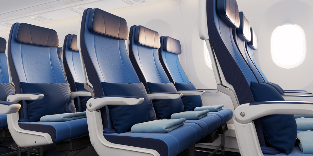 In der neuen Economy Class bieten alle Plätze im Vergleich zur bisherigen Kabine rund drei Zentimeter mehr Sitzabstand (neu 79 Zentimeter) sowie einen grösseren Sitzneigewinkel.