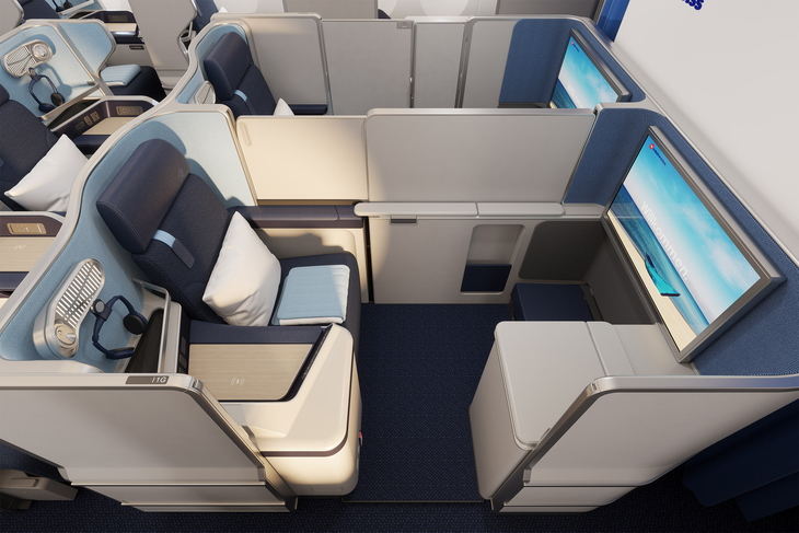 In der Business Class setzt Edelweiss auf eine durchgehende 1-2-1-Bestuhlung mit direktem Gangzugang für alle Gäste. Rund die Hälfte der Sitze ist als Doppelsitz konzipiert und richtet sich an gemeinsam reisende Paare. Die Sitze lassen sich vollständig in flache Betten verwandeln, dunkle Blautöne, gewebte Stoffe und dezente Holzelemente prägen das wohnliche Design.