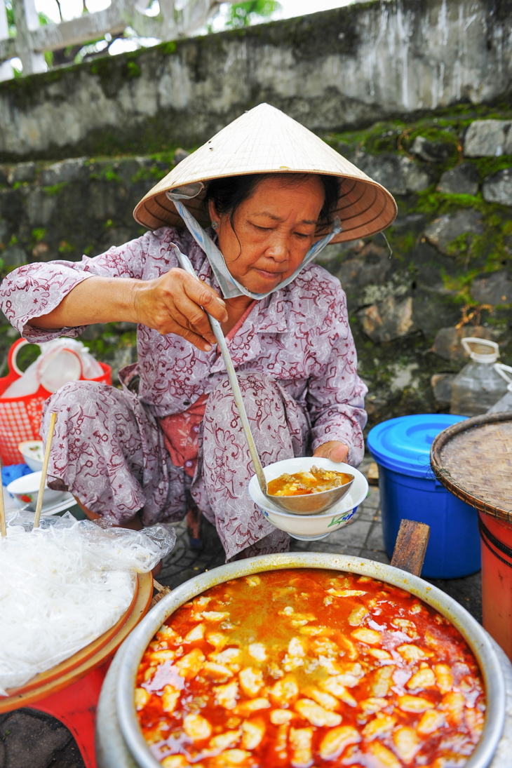 «Banh da xuc hen» besteht aus einem knusprigen Reispapier, welches mit einem Hauch von Sesam und Kokosnuss bestrichen wird. Darunter befinden sich kleine Muscheln, die in Zitronengras, vietnamesischem Koriander, Chili, Zwiebel und Knoblauch gebraten sind. Dieses Gericht gibt es alternativ auch mit Reis – die Muscheln werden dabei in einer kleinen Schüssel dazu serviert.
