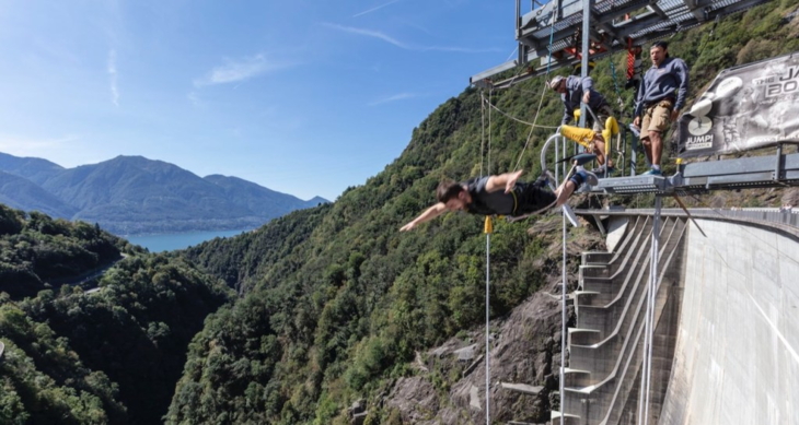 Der Bond-Stunt aus «GoldenEye» zum Nachmachen: Tourist beim Bungee-Jump von der 220 Meter hohen Verzasca-Staumauer. Bild: Ticino Turismo