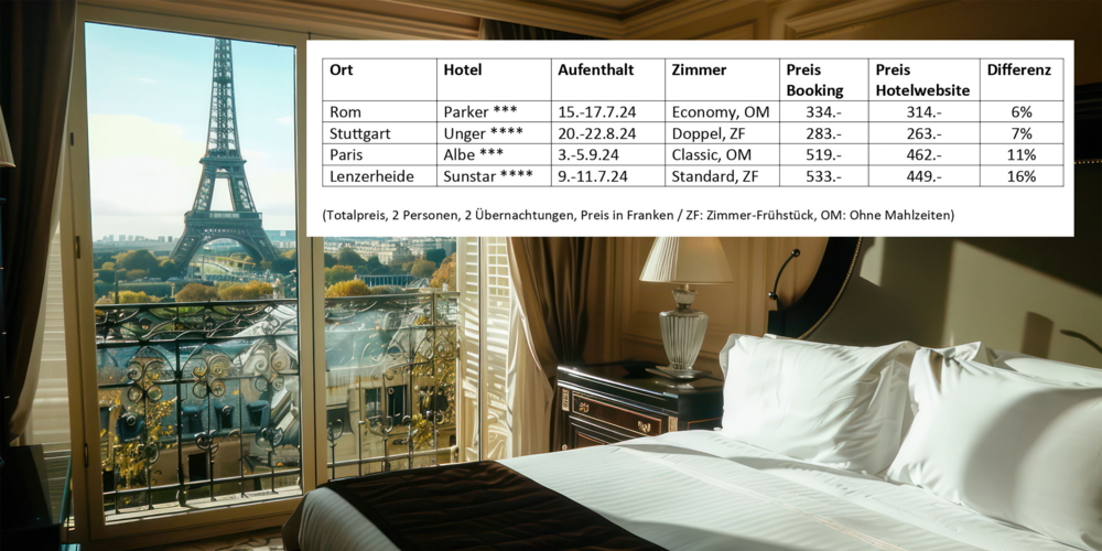 Travelnews hat die Preise von Hotels in der Schweiz, Italien, Deutschland und Frankreich verglichen und stellt erhebliche Preisunterschiede fest. Wer direkt bucht, fährt 6 bis 16 Prozent besser, zeigt der Vergleich von Beispielen in Rom, Paris, Stuttgart und Lenzerheide (siehe Bild oben). Bei total zehn verglichenen Hotels, warten in sechs Fällen die Hotelwebsites mit tieferen Raten auf. In vier Fällen sind die Preise auf Booking identisch mit jenen der Hotelwebsites.