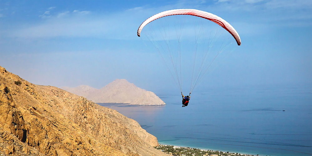 Eine Ankunft der anderen Art: Das Six Senses Zighy Bay bietet bei der Ankunft einen Gleitschirmflug ins Hotel. Auf dem Gipfel des Zighy Mountain angekommen, erwartet ein erfahrener Tandempilot mit dem Gleitschirm. Ausgerüstet mit Helm, Gurt und den nötigen Instruktionen, schwebt man nun aus 293 Metern Höhe ins Tal Richtung Resort, während die Limousine das Gepäck transportiert. Während dem Flug hat man Aussicht auf die faszinierende Wüstenlandschaften und Bergformationen sowie die türkisblaue Omanische See drehen. Der lautlose Flug bietet eine spektakuläre Aussicht und einen ersten Eindruck von dem, was in den nächsten Tagen erwartet.