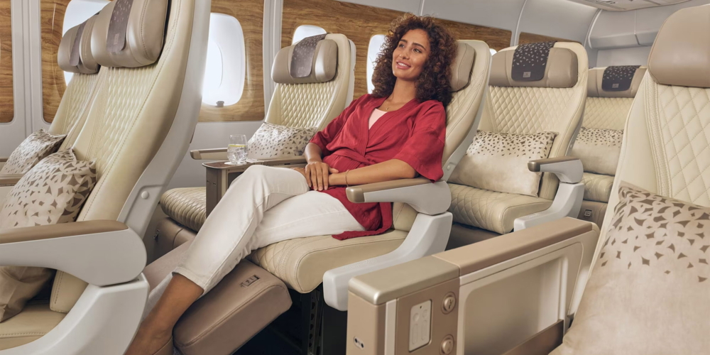 Anfang Juli 2024 wurde mit der Umrüstung dieser Emirates Boeing 777 begonnen. Dabei wurde das Flugzeug neu konfiguriert, um Platz für die neue Premium-Economy-Kabine zu schaffen, die aus 24 Sitzen in drei Reihen in der Anordnung 2-4-2 besteht. Die cremefarbenen Ledersitze, die durch Holzverkleidungen in der gesamten Kabine akzentuiert werden, bieten Komfort mit einem Sitzabstand von 38 Zoll und eine Sitzbreite von 19,5 Zoll, die sich um eine Neigung von acht Zoll verstellen lässt und somit mehr Platz zum Strecken und Entspannen bietet, sowie 6-fach verstellbare Kopfstützen.