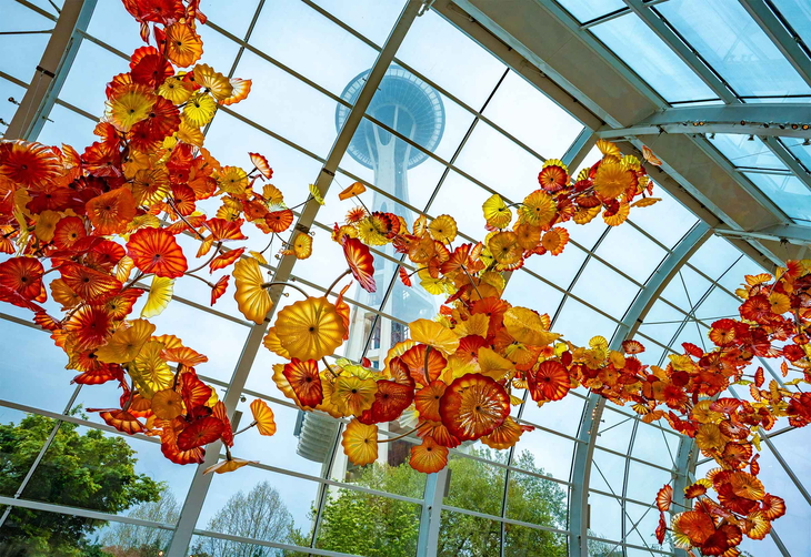 Auch nicht fehlen darf in Seattle ein Besuch des Chihuly Garden & Glass Museums. Die kunstvollen Glaswerke von Dale Chihuly sind weltweit bekannt und beeindrucken mit ihren farbenprächtigen, ausgefallenen Formen. Direkt daneben erhebt sich das offizielle Wahrzeichen der Stadt, die berühmte Space Needle, die jährlich rund eine Million Besucher anzieht.
