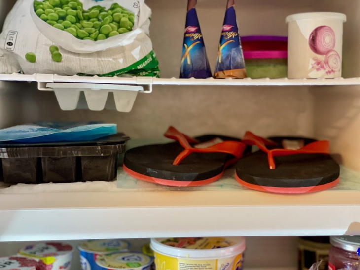 Bei heissem Wetter platziere ich meine Flip-Flops dort. Und wenn meine Unterkunft auf Reisen einen Kühlschrank mit Tiefkühlfach bietet, lege ich meine Zehentrenner auch dort rein. Natürlich hygienisch in eine Rascheltüte verpackt.