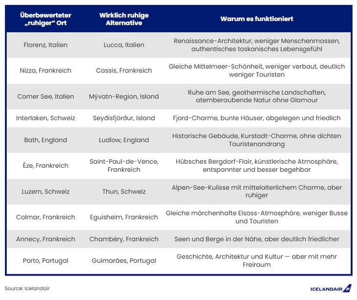 In den Sommermonaten zieht es viele Reisende an idyllische Orte, die Entschleunigung versprechen: Seen, Berge, Altstadtgassen, charmante Cafés. Doch eine aktuelle Analyse von Icelandair wirft einen anderen Blick auf Europas beliebteste Reiseziele.